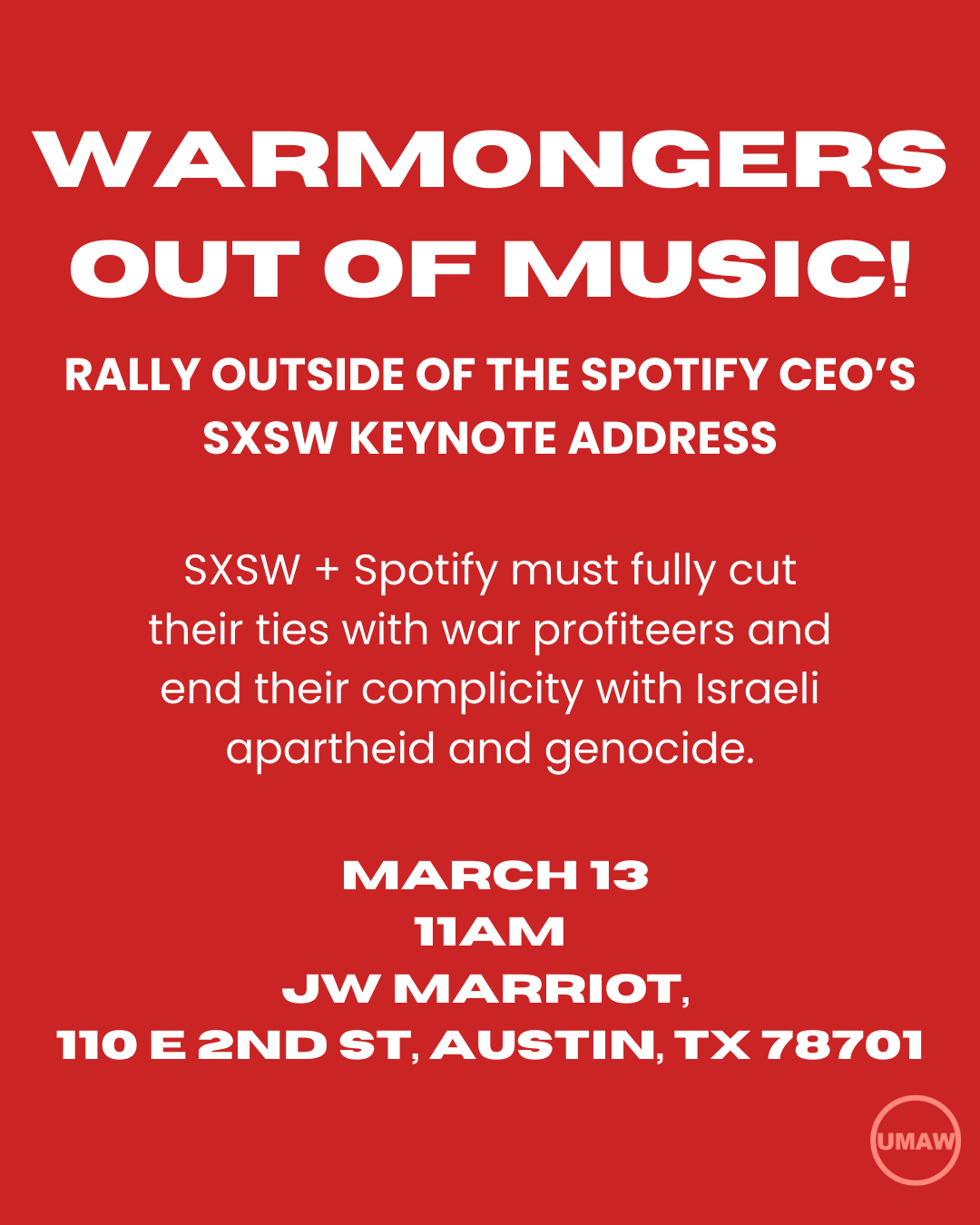 Fri, March 13, 11am - Protest rally demanding "Warmongers Out of Music!" at 11am outside of the SXSW Keynote speech from the new CEO of Spotify. JW Marriot, 110 E 2nd St, Austin, TX. Please sign up here so we can send you updates.