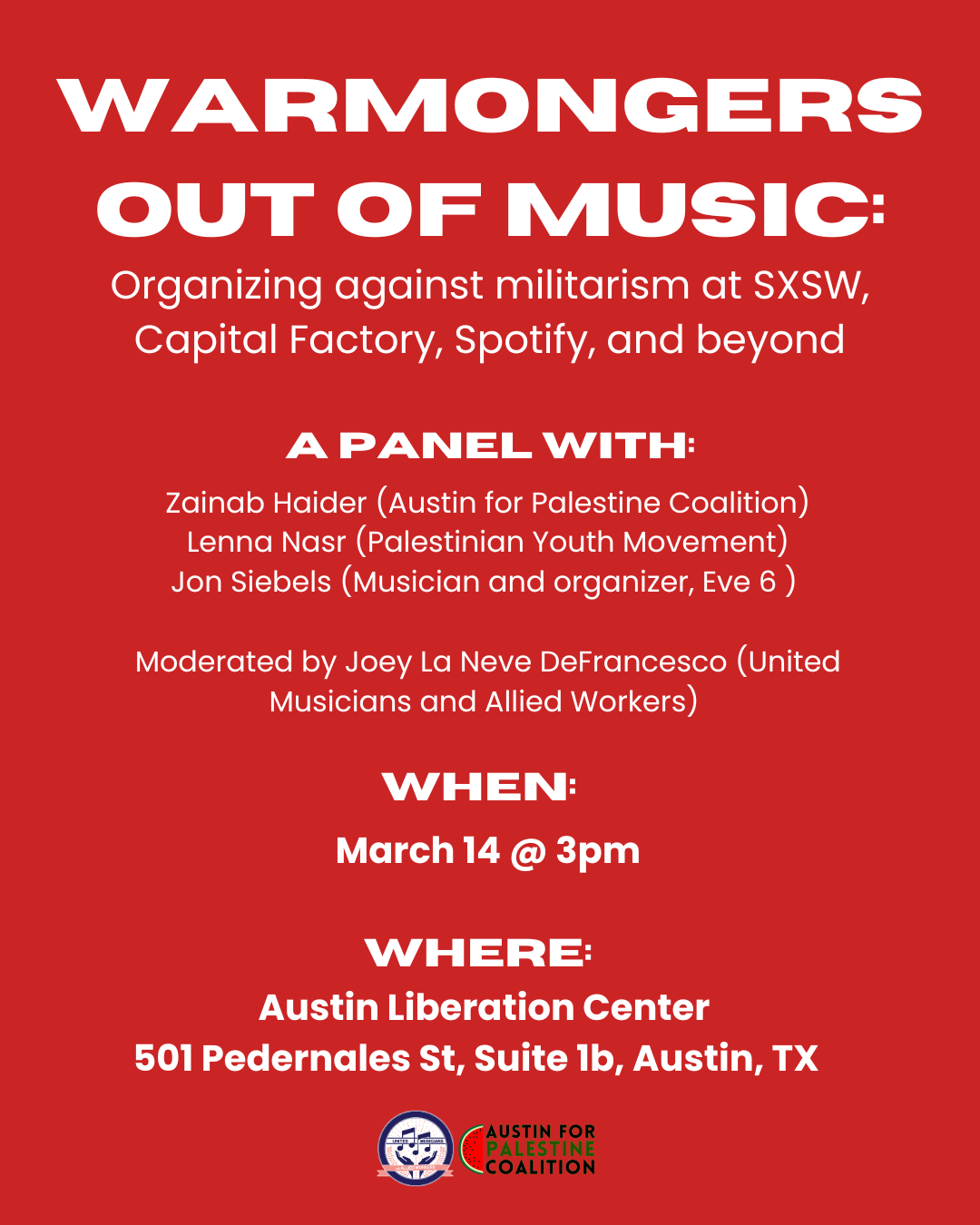 Sat, March 14, 3pm - A panel discussion about kicking the warmongers out of the music industry at 3pm at the Austin Liberation Center. Featuring panelists from UMAW, Palestinian Youth Movement, Austin for Palestine, and more. Full info here.